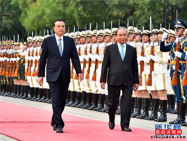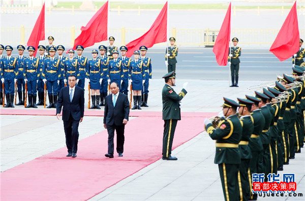 會談前,李克強(qiáng)在人民大會堂東門外廣場為阮春福舉行歡迎儀式。