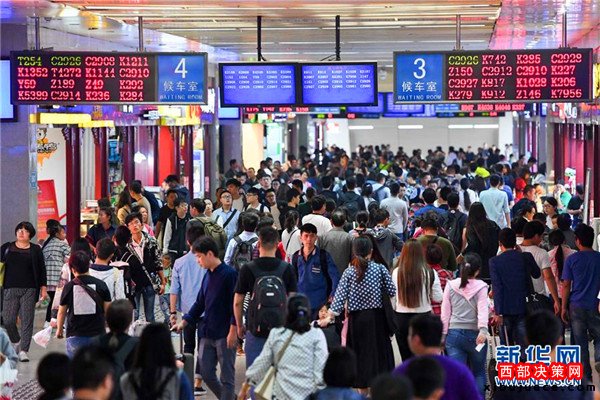 10月7日,乘客在鄭州火車站內(nèi)準(zhǔn)備進(jìn)站乘車。