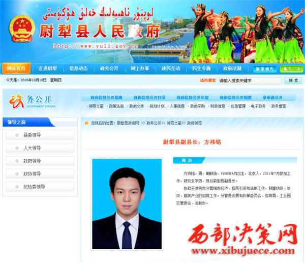 據尉犁縣人民政府官網顯示,方祎銘目前主要工作任務為協(xié)助當地常務副縣長王波分管城市經濟、招商引資和法制工作,側重紡織、針織、服裝產業(yè)的招商工作。分管縣發(fā)展和改革委員會、招商局、工業(yè)園區(qū)管委會、法制辦。
