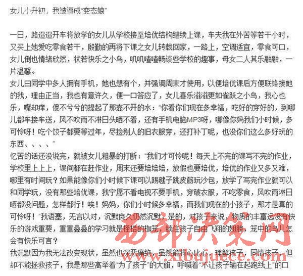 家長(zhǎng)如此不辭辛勞,背后卻也有著道不盡的苦水。武漢一位媽媽就發(fā)出了名為《女兒小升初,我被逼成"變態(tài)娘"》的帖子,講訴自己節(jié)衣縮食,卻給孩子花很多錢(qián)報(bào)各種培訓(xùn)班,控訴"變態(tài)的培優(yōu)市場(chǎng)"和不公平的升學(xué)門(mén)檻,引來(lái)許多家長(zhǎng)共鳴。