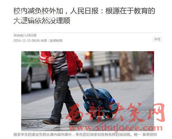 那么到底該從何思考這場(chǎng)學(xué)而思的瘋狂?11月15日出版的《人民日?qǐng)?bào)》表示,校內(nèi)減負(fù)校外加的現(xiàn)象根源在于,教育的大邏輯依然沒(méi)有理順。文章說(shuō),如果不能將招錄制度的改革做足做透,不能將教育資源均衡化的工作咬定不放松,那么校內(nèi)減負(fù)校外加的怪現(xiàn)狀,就會(huì)變著花樣地持續(xù)上演。