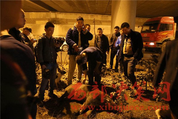 19:15,再次發(fā)現(xiàn)野豬蹤跡,它被狗攆著跑出了區(qū)政府大院,鉆到附近高速路橋下涵洞里。人群正準(zhǔn)備再次抓捕,一輛白色別克轎車駛過,“二師兄”被撞出十多米遠,這下再沒起來。