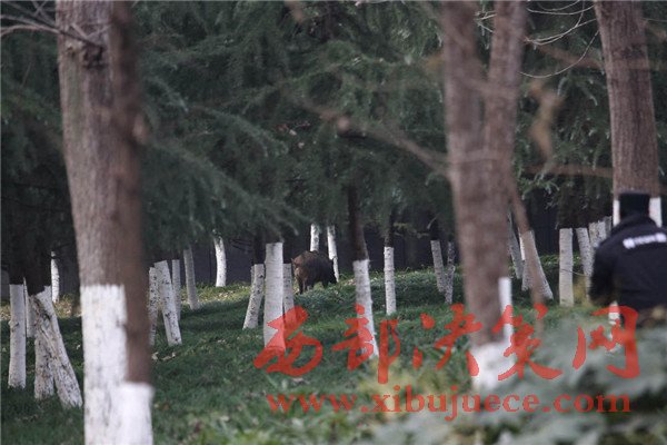 事后動物園工作人員解釋說,3針麻醉全中,野豬似乎睡著了,可人一靠近,這家伙突然驚醒,民警再鳴槍也晚了。17:30,記者跟著民警經(jīng)過區(qū)政府后門,就在這時,野豬踉踉蹌蹌竄出草叢,距記者不到3米,來了第二次“親密接觸”。“藥效到了,應(yīng)該跑不遠。”動物園工作人員邊攆邊說,不過“二師兄”并不配合,一群人找了1個多小時都找不到。
