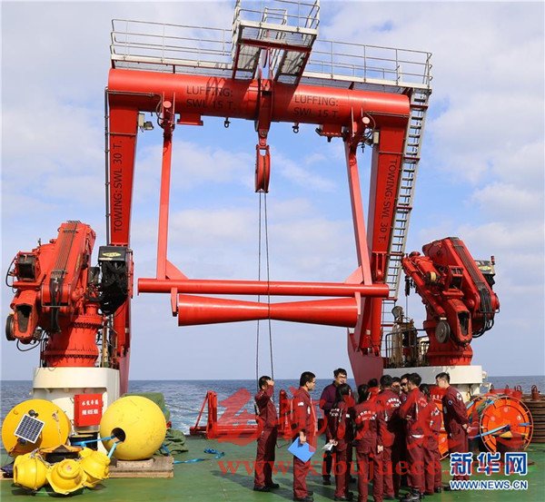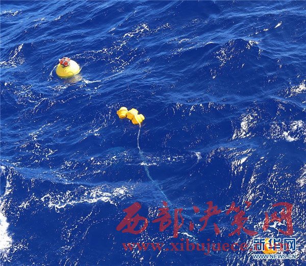 在深海潛標回收作業(yè)中,潛標主浮體和玻璃浮球浮出水面(11月18日攝)。我國遠洋綜合考察船“科學”號正在西太平洋執(zhí)行潛標觀測網(wǎng)維護與升級任務(wù)。截至目前,科考隊員已獲取了140余件觀測設(shè)備連續(xù)1年的現(xiàn)場數(shù)據(jù),維護了8套深海潛標,并重新布放至西太平洋海域。
