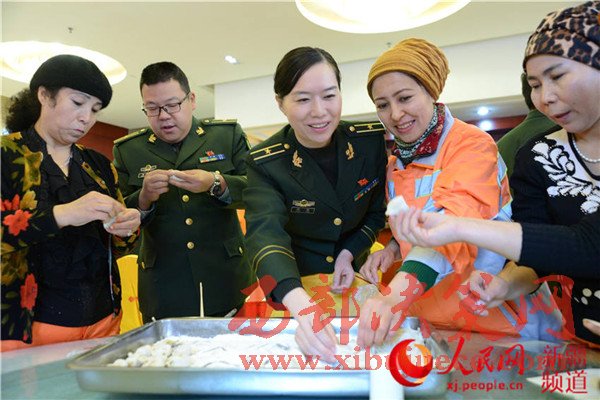 烏魯木齊邊檢站官兵與“親戚”互相夾餃子。