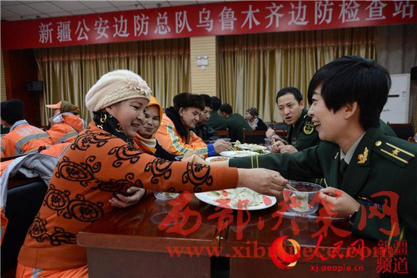 包餃子、聊家常、串門子……12月16日,新疆邊防總隊(duì)烏魯木齊邊防檢查站迎來了烏魯木齊市迎賓路街道辦的41位環(huán)衛(wèi)工人們,并與他們結(jié)成了對(duì)子,成為了“親戚”。