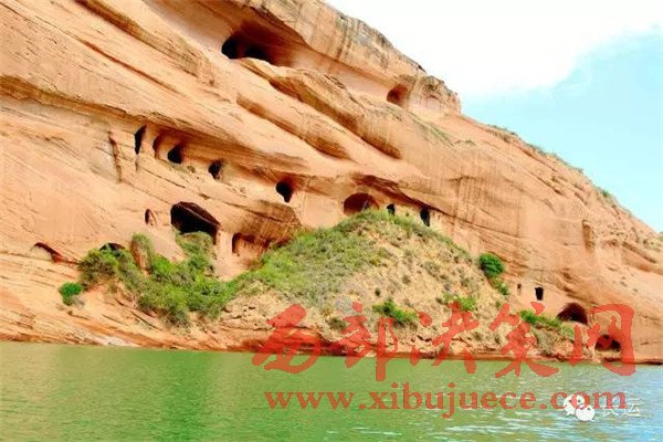 閆寨子,遠(yuǎn)眺是快巨大的紅石頭,巋巍屹立,綠水環(huán)繞,可謂龍洲“赤壁”,離地面百米以上建有窯洞,上下三層,三十多間。