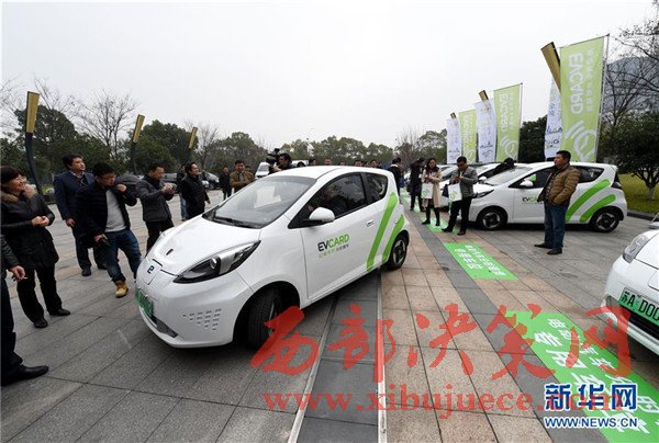 12月22日,在南京市江寧會展中心租還車網(wǎng)點(diǎn)的展示體驗區(qū),人們參觀分時租賃電動汽車并進(jìn)行試乘試駕。