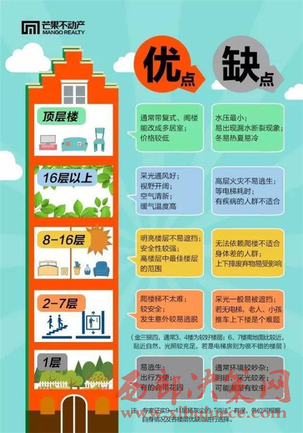 弊:在一些老的小區(qū),高層住宅樓一般水壓較小,有時會出現(xiàn)停水的現(xiàn)象。而且,生火災時不易逃生,并且火災散發(fā)的有毒氣體都是由下向上擴散的,因此是最危險的樓層。