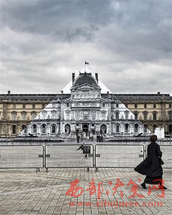 利用攝影技術(shù),法國(guó)街頭藝術(shù)家JR讓巴黎盧浮宮前著名的玻璃金字塔消失了。當(dāng)從一個(gè)精確的角度看過去,金字塔真的不見了,我們得以見到盧浮宮驚人的“真面目”。