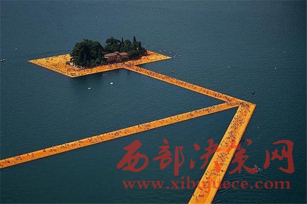 當(dāng)代概念藝術(shù)家Christo因開拓土地藝術(shù)而聞名。在他最新的項(xiàng)目漂浮碼頭中,Christo搭建了很多亮黃色的小路,邀請(qǐng)意大利Sulzano的居民和游客步行通勤至別的導(dǎo)語。和Christo的其他裝置一樣,漂浮碼頭作品中的其他地方景觀也扮演著重要的角色。“湖周圍的山脈提供了鳥瞰該作品的地點(diǎn),展現(xiàn)了那些之前沒被注意的角度”,他解釋道。“水、風(fēng)、太陽,都是這個(gè)項(xiàng)目的一部分。”