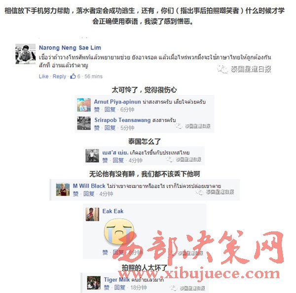 近日,據(jù)泰國網(wǎng)友稱,他的一位朋友因喝酒后頭暈,不慎跌入河道,由于不會(huì)水性,因此只能掙扎,并舉手向路人求救,而路人看見后立即沖上前,緩緩掏出手機(jī),開始各角度拍照,生怕自己錯(cuò)過了什么趣聞,并發(fā)送至臉書平臺(tái),同時(shí)貼文表示,一弱智掉水里了,多名網(wǎng)友還回應(yīng)道:“他怎么掉下去的?哈哈哈。”