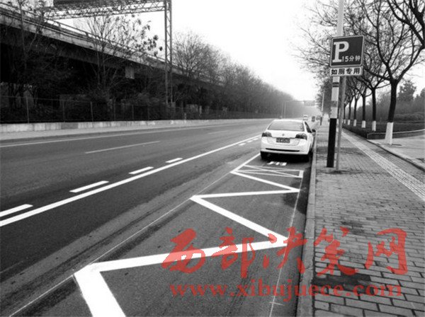 記者現(xiàn)場看到,如廁停車位大多緊鄰公廁,設(shè)置在道沿下的路邊,白色的波折線,前方設(shè)置一個或兩個臨時停車位,停車位采用黃色起止標(biāo)線,標(biāo)線內(nèi)寫有“如廁專用”大字。緊鄰?fù)\囄坏穆愤?,設(shè)有牌,停車牌上寫著“15分鐘”的停車時限。