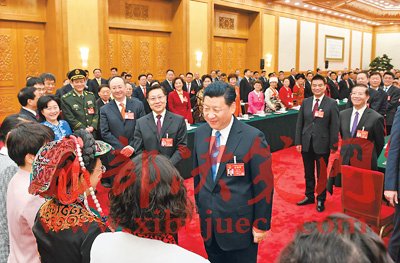 3月8日,中共中央總書記、國家主席、中央軍委主席習(xí)近平參加十二屆全國人大五次會議四川代表團(tuán)的審議。在“三八”國際勞動?jì)D女節(jié)到來之際,習(xí)近平代表黨中央、國務(wù)院,向參加全國兩會的女代表、女委員、女工作人員,向全國各族各界婦女同胞,致以節(jié)日的祝賀和誠摯的祝福。這是習(xí)近平同女代表親切交談。