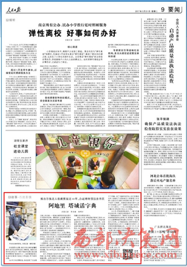 2015年,阿地里面臨退休。“一輩子收藏的這些東西,不能放在家里埋沒了,得讓更多人了解塔城的歷史,了解我們生活的地方。”他找到塔城西部實業(yè)有限公司,把想建一家愛國主義主題博物館的想法跟公司負(fù)責(zé)人一說,得到大力支持。公司提供場地、負(fù)責(zé)沖洗照片,阿地里則將近40年個人收藏的歷史照片、文史資料和剪報奉獻出來。2015年7月1日,在塔城巴克圖口岸對外開放30周年紀(jì)念日時,“絲綢之路邊境貿(mào)易博物館”正式免費對外開放。不到兩年時間,已經(jīng)有3萬多人次前來參觀過,他的科普圖書館也有了100多名固定的讀者。