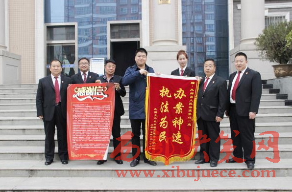 西部決策網(wǎng)訊(帥華鋒 劉恒)3月20日上午,鳳翔大千汽車租賃有限公司總經(jīng)理王某專程送來 “辦案神速 執(zhí)法為民”的錦旗與感謝信,向鳳翔法院執(zhí)行一庭干警王宏斌及執(zhí)行局全體干警表達(dá)謝意,感謝他們在辦案中不辭辛苦,公正執(zhí)法,有力的維護(hù)了當(dāng)事人合法權(quán)益。