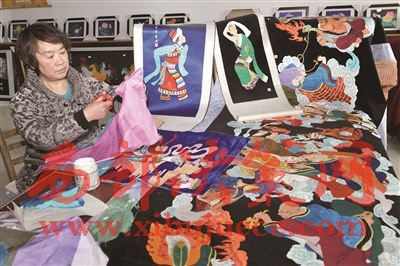 現(xiàn)任青海省民間工藝美術(shù)大師、國家非物質(zhì)文化遺產(chǎn)湟中堆繡的青海省代表性傳承人、湟中縣堆繡協(xié)會會長的喬應(yīng)菊,自幼酷愛民間工藝,三十年前經(jīng)塔爾寺三絕藝術(shù)之一的堆繡老藝僧智華恩師的傳授,她執(zhí)著追求,苦學(xué)至今,形成了她特有的堆繡造型和配色特色。她對記者說:“堆繡是一種運用‘剪’、‘堆’技法塑造的獨特藝術(shù),用各色質(zhì)地不同的綢緞剪出人物、花鳥、山水等各種圖案,再根據(jù)設(shè)計需求逐一堆貼在黑色底子的大幅布幔上,形成了一個完整的畫面。堆繡分為‘平剪堆繡’和‘立體堆繡’,前者是將各色布料堆貼在事先設(shè)計好的圖案上,用彩線或金銀線鑲邊而成;后者則是用各色綢緞剪成佛像、人物、花卉等多種圖形,然后充塞羊毛或棉花,再用絲線繡織。堆繡整體圖案極富有立體感,人物形象逼真,畫面色調(diào)和諧,產(chǎn)生出豐富而生動的立體感和織物特有的肌理感,具有浮雕式的藝術(shù)效果,深受人們的喜愛”。