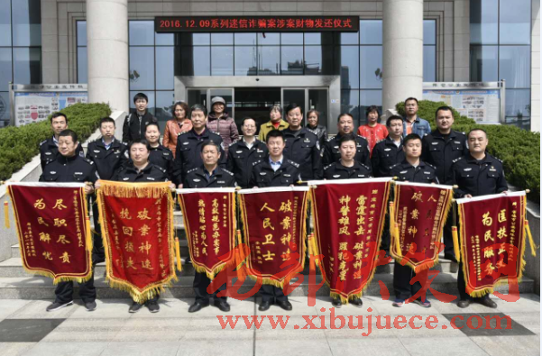 當(dāng)日,陳倉公安分局現(xiàn)場向來自甘肅省會寧縣的受害群眾宋某芳和來自寶雞市千陽縣的受害群眾邢某俠等7名群眾共計(jì)發(fā)放被騙贓款170000余元。當(dāng)宋某芳等7名群眾從該局局長楊會軍和政委苗寶平手中領(lǐng)到被騙的現(xiàn)金時(shí)喜極而泣,不時(shí)的連聲說“感謝公安局、感謝公安民警、真是謝謝啦”,有的群眾面向公安民警和媒體記者深深鞠躬表達(dá)謝意,并將七面繡著“人民衛(wèi)士、破案神速,為民服務(wù)、匡扶正義”等內(nèi)容的大紅錦旗增送到民警手中,表達(dá)心中的謝意。受害群眾被騙的款數(shù)從數(shù)千元到數(shù)萬元不等,最高達(dá)50000余元。