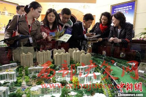 資料圖:購(gòu)房人在樓盤(pán)看沙盤(pán)并咨詢(xún)售樓工作人員。