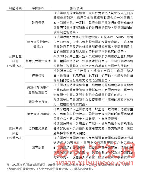 “一帶一路”建設(shè)中重要國家的治理風(fēng)險(xiǎn)是我們的主要關(guān)注對象,在借助國內(nèi)外智庫和科研院所已完成的眾多研究成果的基礎(chǔ)上,建立一套對節(jié)點(diǎn)國家風(fēng)險(xiǎn)的評級體系,如表1(見P28)所示。節(jié)點(diǎn)國家風(fēng)險(xiǎn)評價(jià)指標(biāo)中,政治風(fēng)險(xiǎn)與經(jīng)濟(jì)風(fēng)險(xiǎn)的評價(jià)參考經(jīng)濟(jì)學(xué)人智庫的國家風(fēng)險(xiǎn)模型(EIU country risk model);公共衛(wèi)生風(fēng)險(xiǎn)的評價(jià)參考中國衛(wèi)生與經(jīng)濟(jì)社會(huì)發(fā)展統(tǒng)計(jì)數(shù)據(jù)庫對公共衛(wèi)生的指標(biāo)設(shè)計(jì);國際沖突風(fēng)險(xiǎn)評價(jià)根據(jù)經(jīng)濟(jì)學(xué)人智庫發(fā)布的白皮書《愿景與挑戰(zhàn)——“一帶一路”沿線國家風(fēng)險(xiǎn)評估》與中國出口信用保險(xiǎn)公司發(fā)布的2015年版《國家風(fēng)險(xiǎn)分析報(bào)告》和《全球風(fēng)險(xiǎn)地圖》綜合考量得出。具體而言,我們可以從“政治風(fēng)險(xiǎn)”“經(jīng)濟(jì)風(fēng)險(xiǎn)”“公共衛(wèi)生風(fēng)險(xiǎn)”和“國際沖突風(fēng)險(xiǎn)”四個(gè)維度來評估選擇出的節(jié)點(diǎn)國家的風(fēng)險(xiǎn),如表2(見P30)所示。