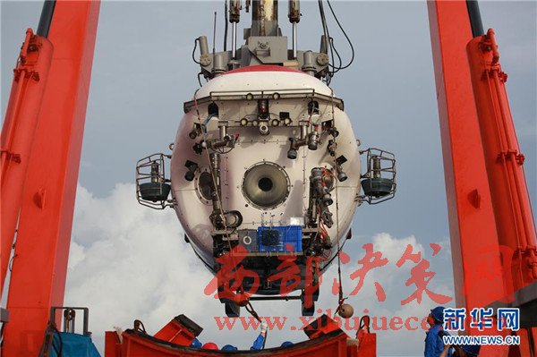 5月23日,“蛟龍”號完成下潛準備回到“向陽紅09”科學(xué)考察船上。