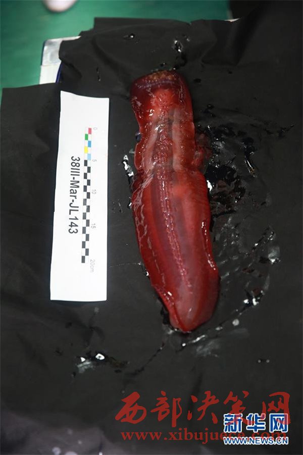 這是5月23日拍攝的“蛟龍”號在馬里亞納海溝帶回的生物樣品海參。