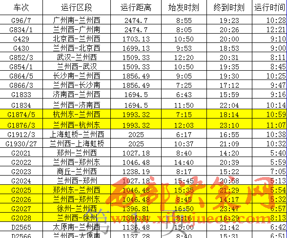 從寶蘭高鐵列車開(kāi)行方案來(lái)看,蘭州西至北京西開(kāi)行動(dòng)車組列車1對(duì),為列車雙向?qū)﹂_(kāi),共計(jì)運(yùn)行1699公里,9:53從蘭州西站始發(fā),18:53達(dá)到北京西站,車次為 G430次,運(yùn)行時(shí)間9小時(shí)整;10:50從北京西站始發(fā),20:00到達(dá)蘭州西站,車次為 G429次。蘭州西至廣州南開(kāi)行動(dòng)車組列車1對(duì),為列車雙向?qū)﹂_(kāi),共計(jì)運(yùn)行2474.7公里,8:05從蘭州西站始發(fā),20:26到達(dá)廣州南站,車次為 G834/1次;8:55從廣州南站始發(fā),19:23到達(dá)蘭州西站,車次為 G96/7次,運(yùn)行時(shí)間10小時(shí)28分。蘭州西至上海虹橋站開(kāi)行動(dòng)車組列車1對(duì),為列車雙向?qū)﹂_(kāi),共計(jì)運(yùn)行2025公里,10:37從蘭州西站始發(fā),21:09到達(dá)上海虹橋站,車次為 G1930/27次,運(yùn)行時(shí)間10小時(shí)32分;6:17從上海虹橋站始發(fā),16:55到達(dá)蘭州西站,車次為 G1912/3次。