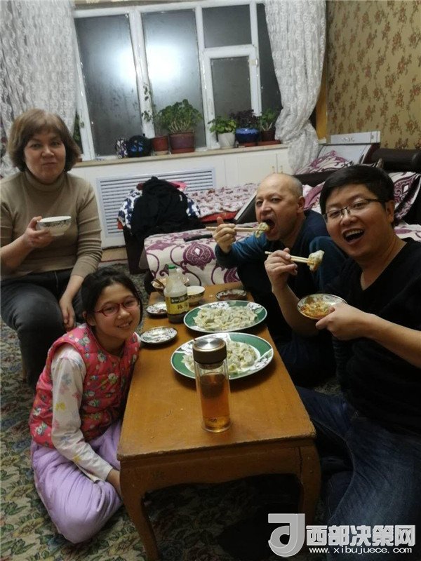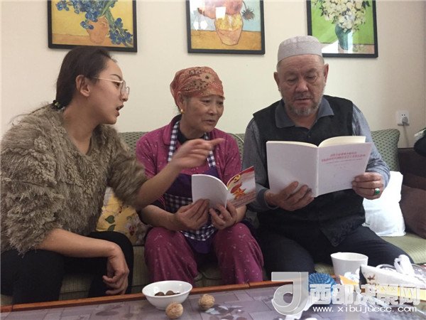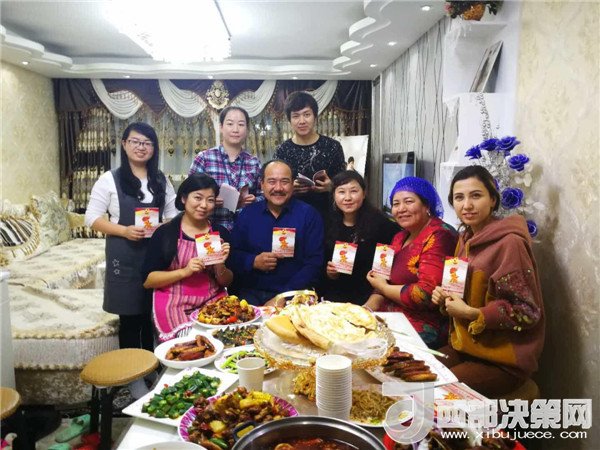傍晚,一大群來(lái)自不同民族,不同單位的新疆兒女聚在了一起,紛紛加入到這個(gè)民族團(tuán)結(jié)的大聚會(huì)里,彈一首歡快悅耳的冬不拉,舞一曲深情優(yōu)美的賽乃姆,唱一首民族團(tuán)結(jié)的贊歌,將整個(gè)聚會(huì)推向高潮。賽買(mǎi)提·阿合買(mǎi)提高興地說(shuō):“我今天太開(kāi)心了!這個(gè)結(jié)婚紀(jì)念日太有意義了,你的親戚,我的親戚,變成了我們的親戚,以后這就是你們的家,你們要經(jīng)常來(lái)啊!” 趁著大家都在興頭上,韓莉書(shū)記又拿出學(xué)校專門(mén)印制的《不忘初心 牢記使命-黨的十九大精神進(jìn)校園讀本》,熱情地為親戚們宣傳起十九大精神,給大家講起黨的好政策來(lái)。在得知艾來(lái)提·賽買(mǎi)提目前還沒(méi)有找到合適的工作,沒(méi)有穩(wěn)定收入的情況后,大家立刻表示愿意幫助他早日找到合適的工作,幫助他們解決最實(shí)際的困難,把溫暖送到他們的心坎中。大家唱唱跳跳,說(shuō)說(shuō)笑笑,其樂(lè)融融,在互幫互助中讓民族團(tuán)結(jié)之花越開(kāi)越艷。