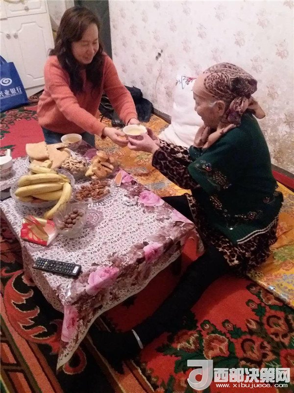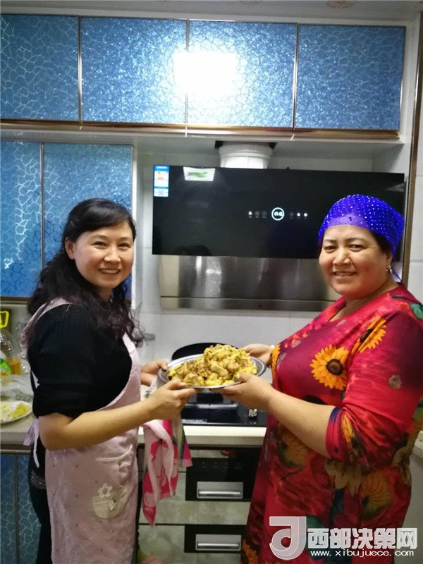 艾來(lái)提·賽買(mǎi)提的父親賽買(mǎi)提·阿合買(mǎi)提一面接過(guò)韓莉書(shū)記手里的米、面、清油和兩大兜食材,一面心疼地埋怨:“這么冷的天,你們又拿這么多東西,多辛苦,你上次送來(lái)的東西還沒(méi)有吃完呢。”韓莉和王艷萍笑而不語(yǔ),心里默默地盤(pán)算著帶給親戚意外的驚喜。因?yàn)榘瑏?lái)提·賽買(mǎi)提和愛(ài)人長(zhǎng)期兩地分居,聚少離多。今天正好是他們父母結(jié)婚三十周年紀(jì)念日,她們?nèi)嗽缇蜕塘亢靡欢ㄒH手做一頓飯,邀請(qǐng)這個(gè)民族團(tuán)結(jié)大院里附近的同事和各自的親戚一起來(lái)給這個(gè)小家庭舉辦一場(chǎng)別開(kāi)生面的大融合聚會(huì),她們忙碌著,擇、洗、炒,撲鼻的香味彌漫在親戚的家中……