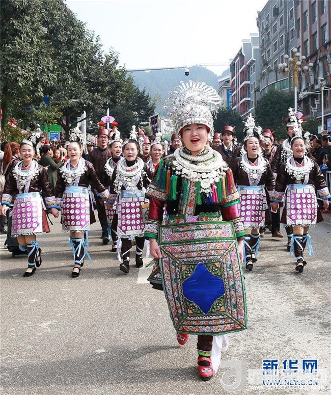 12月18日,身著盛裝的侗族同胞參加巡游。當(dāng)日,2017中國侗年暨第八屆黎平·中國侗文化旅游節(jié)“非遺”文化巡游在貴州省黔東南苗族侗族自治州黎平縣舉行,當(dāng)?shù)囟弊逋麣g聚一堂,喜迎侗年到來。(林世禎 攝)