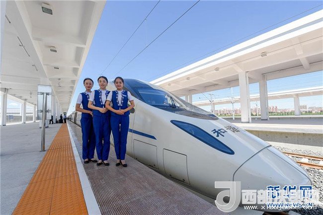 乘務(wù)組人員在烏蘭察布站與動車組合影(8月3日攝)。8月3日,內(nèi)蒙古首列高鐵D6980次列車伴隨著嘹亮的汽笛聲,駛出呼和浩特東火車站,以250公里的時速駛向?yàn)跆m察布站,內(nèi)蒙古自此正式邁進(jìn)高鐵時代。