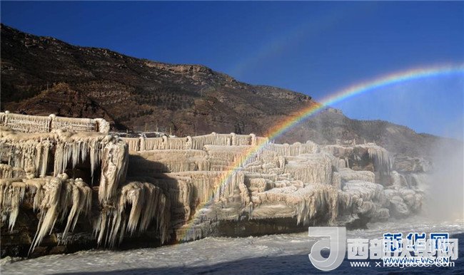 這是12月17日在山西吉縣黃河壺口瀑布拍攝的冰瀑彩虹景觀。當(dāng)日,黃河壺口瀑布出現(xiàn)彩虹景觀。壺口瀑布兩岸姿態(tài)萬千的冰瀑,與瀑布上空的彩虹相映成趣,美不勝收。(饒北成 攝)