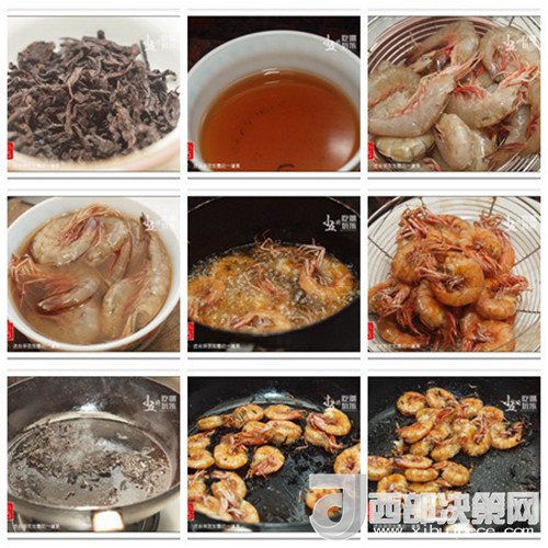 準(zhǔn)備好烏龍茶;加入開水沖泡,第一泡茶水倒掉,其他的茶水沖在碗里,茶葉瀝干水分待用;海蝦去除蝦頭,蝦背剪開;將蝦放入茶水中,浸泡1個小時(shí),撈出瀝干水分;熱油,下蝦,用中火炸至蝦金黃;取出,再快速復(fù)炸一遍,瀝干油;取一平底鍋,下1湯匙左右的油,溫度足夠時(shí),下茶葉,用中小火炒出茶葉的香味;下蝦,繼續(xù)用中小火炒均勻,炒至蝦變熱;加入椒鹽粉調(diào)味,即可熄火。