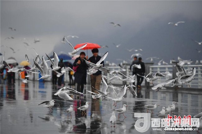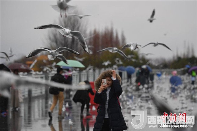 1月3日,紅嘴鷗在滇池邊與游客親密接觸。當(dāng)日,“春城”昆明淅淅瀝瀝的小雨下個不停,仍有眾多游客和市民來到滇池邊,與西伯利亞的“白色精靈”——紅嘴鷗相會,領(lǐng)略昆明別樣美景。(記者 劉冉陽 攝)
