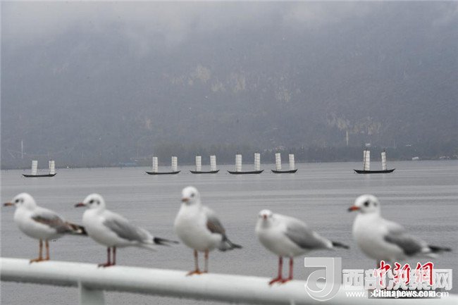 1月3日,排排站的紅嘴鷗與遠(yuǎn)處的帆船相應(yīng)成趣。(記者 劉冉陽 攝)