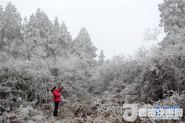 1月7日,一名游客在貴州省黔東南苗嶺國家地質(zhì)公園拍攝霧凇景觀。寒冬時節(jié),位于貴州省黔東南州的苗嶺國家地質(zhì)公園出現(xiàn)云海霧凇景觀,原始森林和草場在云海中若隱若現(xiàn),美若畫卷。(楊文斌攝)