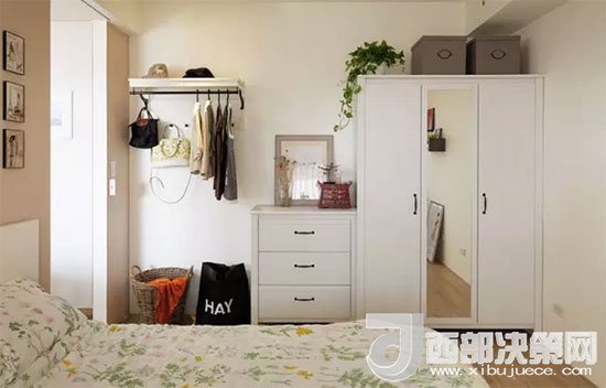 藤筐、收納箱、掛衣桿、衣柜,各種收納工具一應(yīng)俱全,搭配得十分得宜。衣柜中間柜門上安裝了全身鏡。對于不愿把鏡子放進(jìn)臥室的房友們來說,不知道這樣子布置會不會稍好一些。