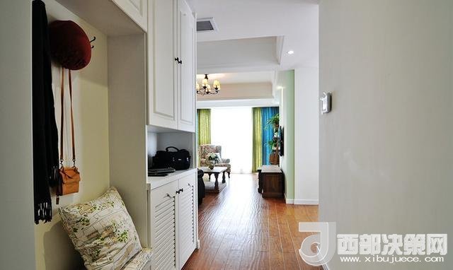 進(jìn)門玄關(guān),貼壁做了一排的櫥柜,模仿國(guó)外家居設(shè)計(jì),做了一個(gè)連體的矮柜換鞋凳,上方安裝掛鉤吊衣服。