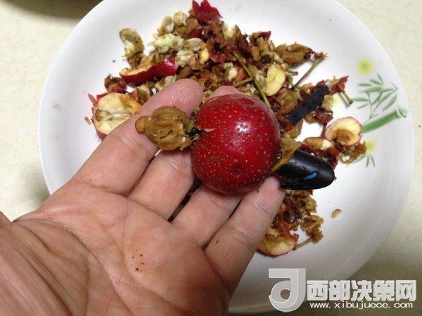 3.找一個(gè)廢筆桿,用筆桿從一端穿過(guò),山楂核就被輕松去掉了