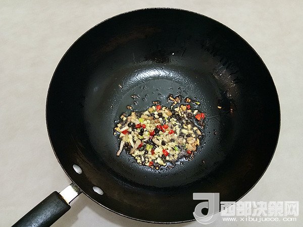 7.鍋中放少許底油,放入豆豉、蔥花、蒜末、干辣椒小火炒香。