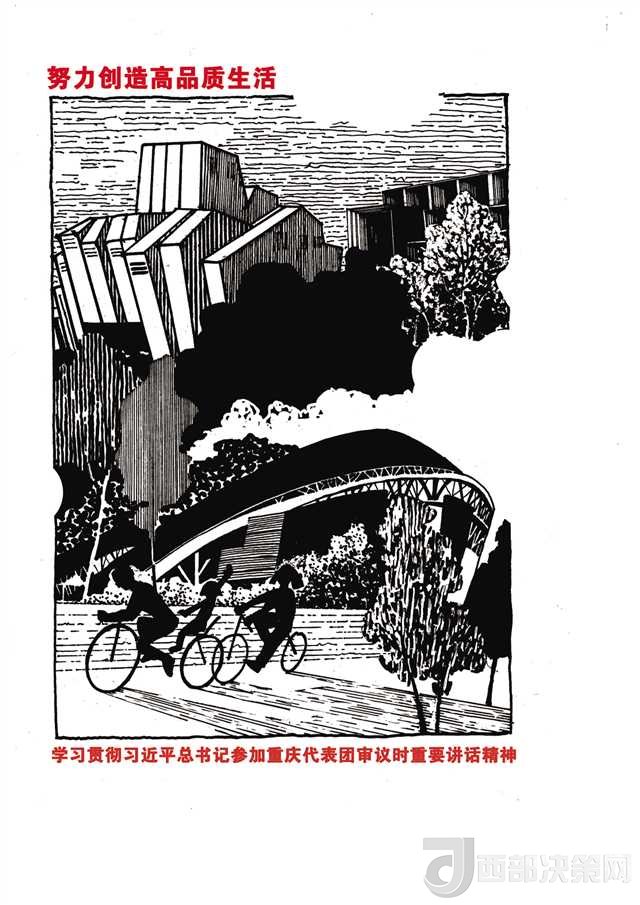 另一組負(fù)責(zé)“創(chuàng)造高品質(zhì)生活”的師生也遭遇類(lèi)似的問(wèn)題。最初師生們想用一組市民在公園鍛煉的場(chǎng)景來(lái)闡述這個(gè)主題,但很快就發(fā)現(xiàn)這樣的畫(huà)面太簡(jiǎn)單蒼白。最終,他們將重慶大劇院、重慶美術(shù)館、奧體中心等重慶的標(biāo)志性建筑作為文化符號(hào)列入畫(huà)稿中,才有了令人耳目一新的感覺(jué)。
