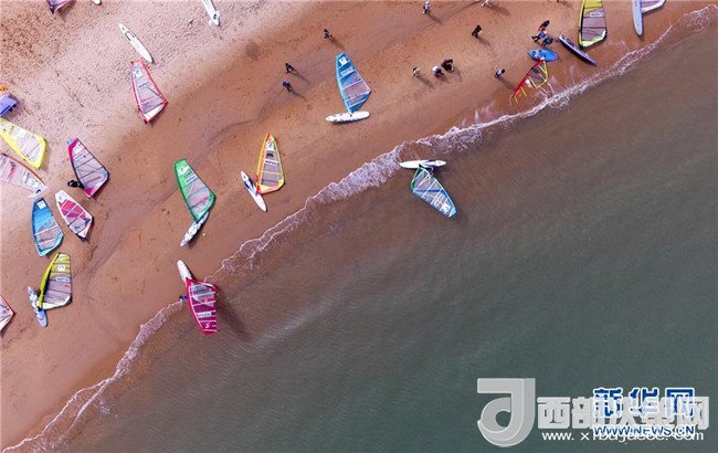 在三亞蜈支洲島參加2016動(dòng)力沖浪板國際賽中國站的選手在比賽中(2016年9月18日無人機(jī)拍攝)。新華社記者 楊冠宇 攝