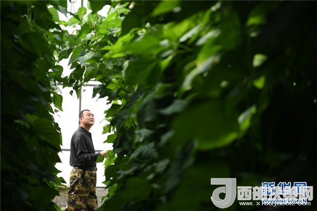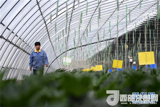 4月18日,村民孔景云在甘肅省酒泉市肅州區(qū)總寨戈壁農(nóng)業(yè)產(chǎn)業(yè)園的日光溫室內(nèi)查看蔬菜生長情況。