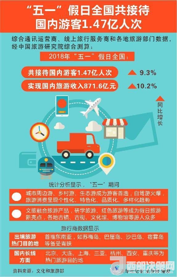 “五一”期間,全國假日旅游消費旺盛,旅游市場持續(xù)增長。綜合通訊運(yùn)營商、線上旅行服務(wù)商和各地旅游部門數(shù)據(jù),經(jīng)中國旅游研究院綜合測算,“五一”假日全國共接待國內(nèi)游客1.47億人次,同比增長9.3%,實現(xiàn)國內(nèi)旅游收入871.6億元,同比增長10.2%。