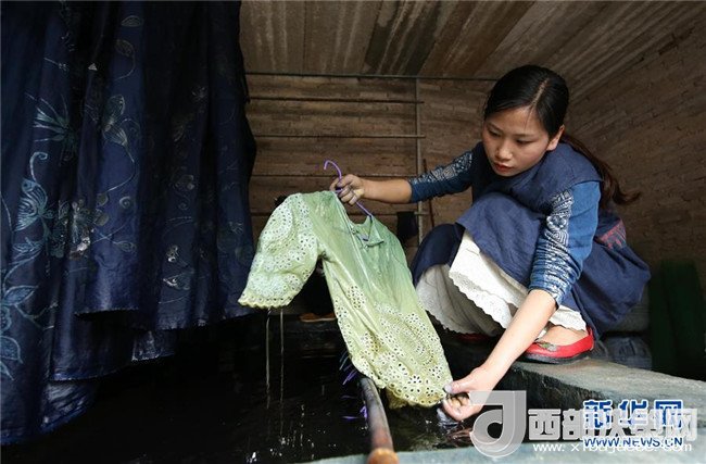 5月2日,在貴州省丹寨縣,張義蘋在染房內(nèi)查看蠟染產(chǎn)品的染色效果。