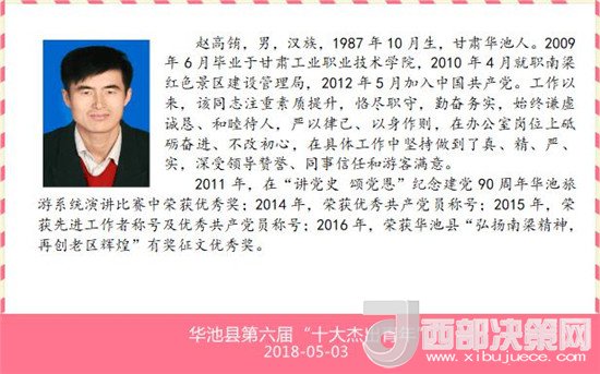 西部決策網(wǎng)——西部大開發(fā)訊(帥華鋒 張曉紅 通訊員 陳彥榮 柴金霞)5月3日,在南梁法官教育基地講法堂,華池團(tuán)縣委隆重召開紀(jì)念“五四”運動99周年暨第六屆“十大杰出青年”表彰大會。甘肅南梁革命紀(jì)念館趙高銪同志榮獲華池縣第六屆“十大杰出青年”榮譽(yù)稱號。