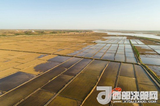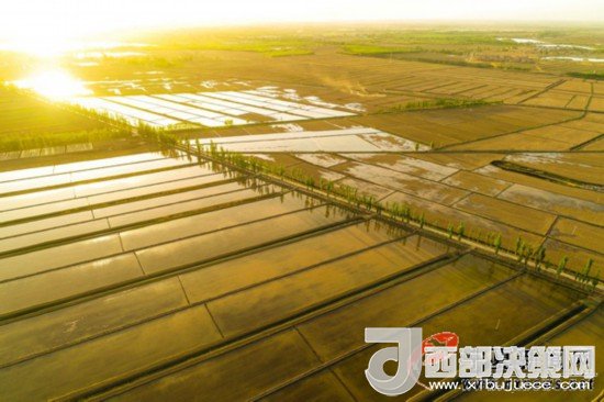 5月6日18時50分許,伴著落日金色的余暉,銀川市賀蘭縣黃河邊剛剛灌水的稻田波光粼粼,銀川平原引黃灌區(qū)稻田灌水,即將進入插秧季。 寧夏新聞網(wǎng)記者 祁瀛濤 攝