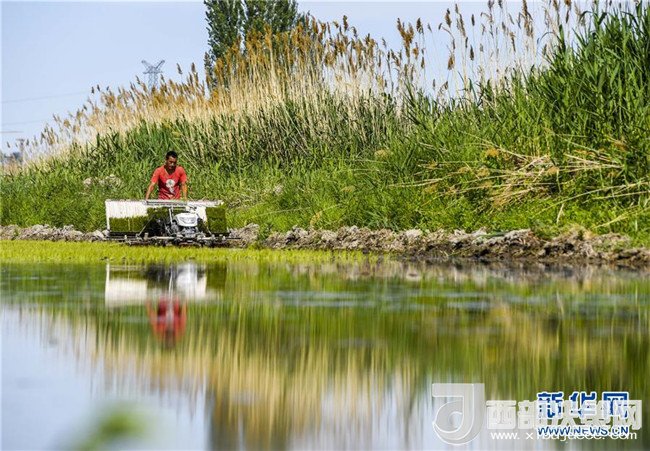 夕陽西下,村民在新疆察布查爾錫伯自治縣種羊場托海依村的一處農(nóng)田里勞動(5月21日攝)。近日,隨著氣溫漸高,地處新疆伊犁河谷的察布查爾錫伯自治縣迎來插秧高峰期,田間地頭一派繁忙景象。塊塊稻田水滿如鏡,田間防護林枝繁葉茂,遠處雪山依稀可見,如一幅在大地上鋪展開的生態(tài)畫卷。新華社記者胡虎虎攝