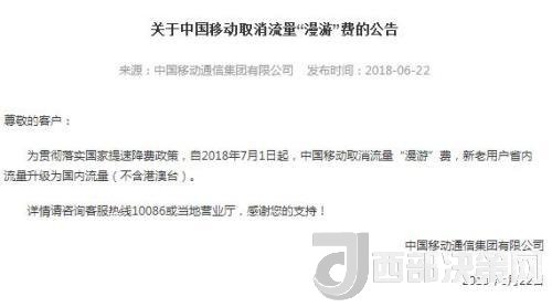 中國移動22日在官網發(fā)布關于取消流量“漫游”費的公告,公告稱,自2018年7月1日起,中國移動取消流量“漫游”費,新老用戶省內流量升級為國內流量(不含港澳臺)。