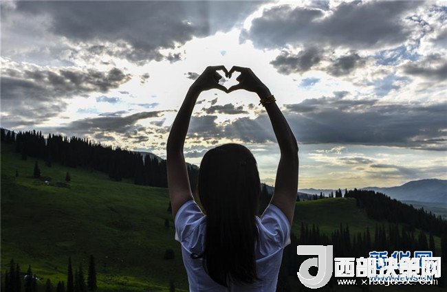 在那拉提景區(qū)天成臺,一位游客迎著夕陽做出了“心”的動(dòng)作(7月8日攝)。